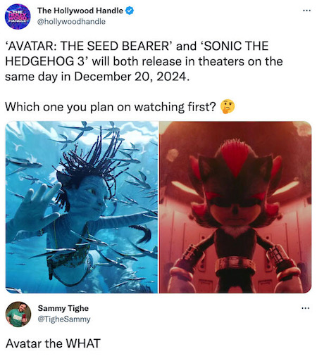 I’m pretty sure that the next “Avatar” WILL NOT have that name and I’m pretty sure that “Sonic the Hedgehog 3” will not be released on the same day.
