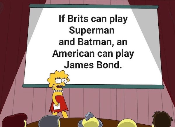 Former Superman Henry Cavill is from “Jersey” (NOT New Jersey – it’s the largest of the channel islands between England and France), former Batman Christian Bale is from Wales, and current Batman (I believe) Robert Pattinson is from England. So, I think the next James Bond should be Tom Hardy….wait….Aaron Taylor-Johnson….nope…..Idris Elba….not him either………Brad Pitt!!!! YES! HE’S NOT FROM ENGLAND.