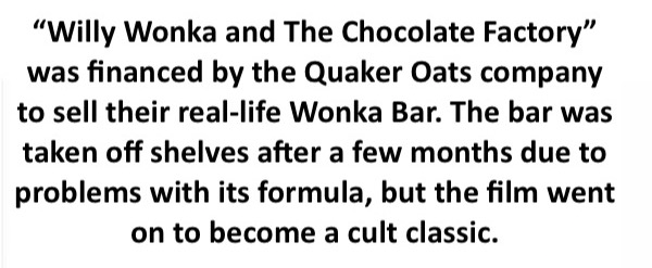It’s true. I wonder if the success of the movie made up for the failure of the Wonka Bar. Also, years later a company – maybe the same company – tried to release new Wonka Bars, but they still weren’t that successful.