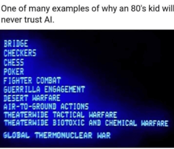 That list is from the movie “WarGames” (1983). If the rumored remake is real, it will DEFINITELY need to have something to do with A I.