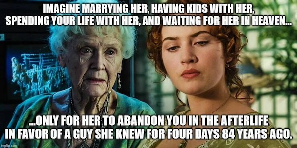 It’s true. The older Rose boards the ship with HER GRANDDAUGHTER Lizzy Calvert. So, she must have gotten married, had at least one child, and had at least one granddaughter but NONE OF THOSE PEOPLE mean as much to her as a guy she knew for a few days.