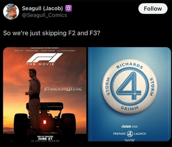 I’d like to see “F2” and “F3”. I wonder which movie transitions the story from a racing movie to a group of superheroes. I also wonder which superhero or supervillain Brad Pitt would be.