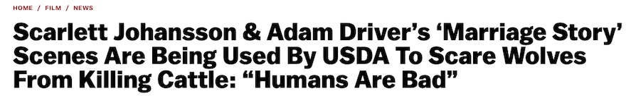 “Riding to the rescue are drone cowhands, whose quadcopters have thermal cameras that can reveal any wolf lurking in the darkness and bathe it in a spotlight. A loudspeaker broadcasts alarming sounds like fireworks, gunshots and people arguing. One recording is of the fight between Scarlett Johansson and Adam Driver in the movie Marriage Story…”