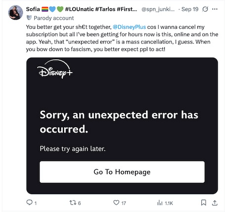 Then, so many people protesting Disney/ABC cancelling the Jimmy Kimmel talk show canceled their Disney+ or Hulu accounts the websites and apps froze.