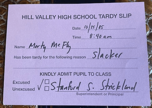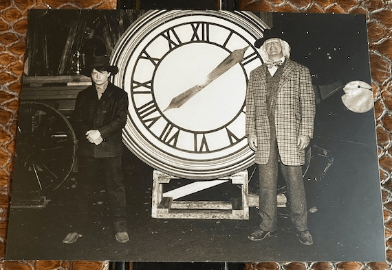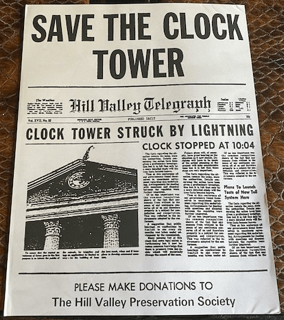 A reproduction of the “Save the Clock Tower” from the first movie complete with the girlfriends phone number on the back.