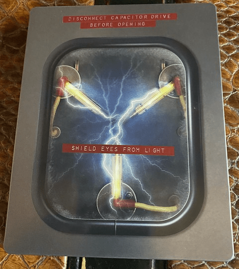 Next is the case which holds all 3 movies in 4K and Blu-ray plus 2 more discs of bonus features. The photo is the flux-capacitor from the DeLorean.